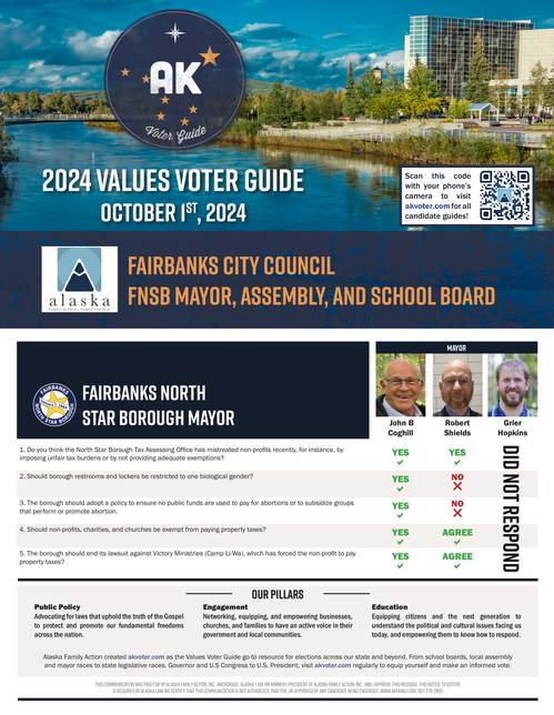 Alaska Family Action, the legislative and advocacy arm of Alaska Family Council, created the AK Voter Guide as a free nonpartisan resource for Alaskans who want to discover where their local candidates stand on key issues. Click below to download your copy today!
